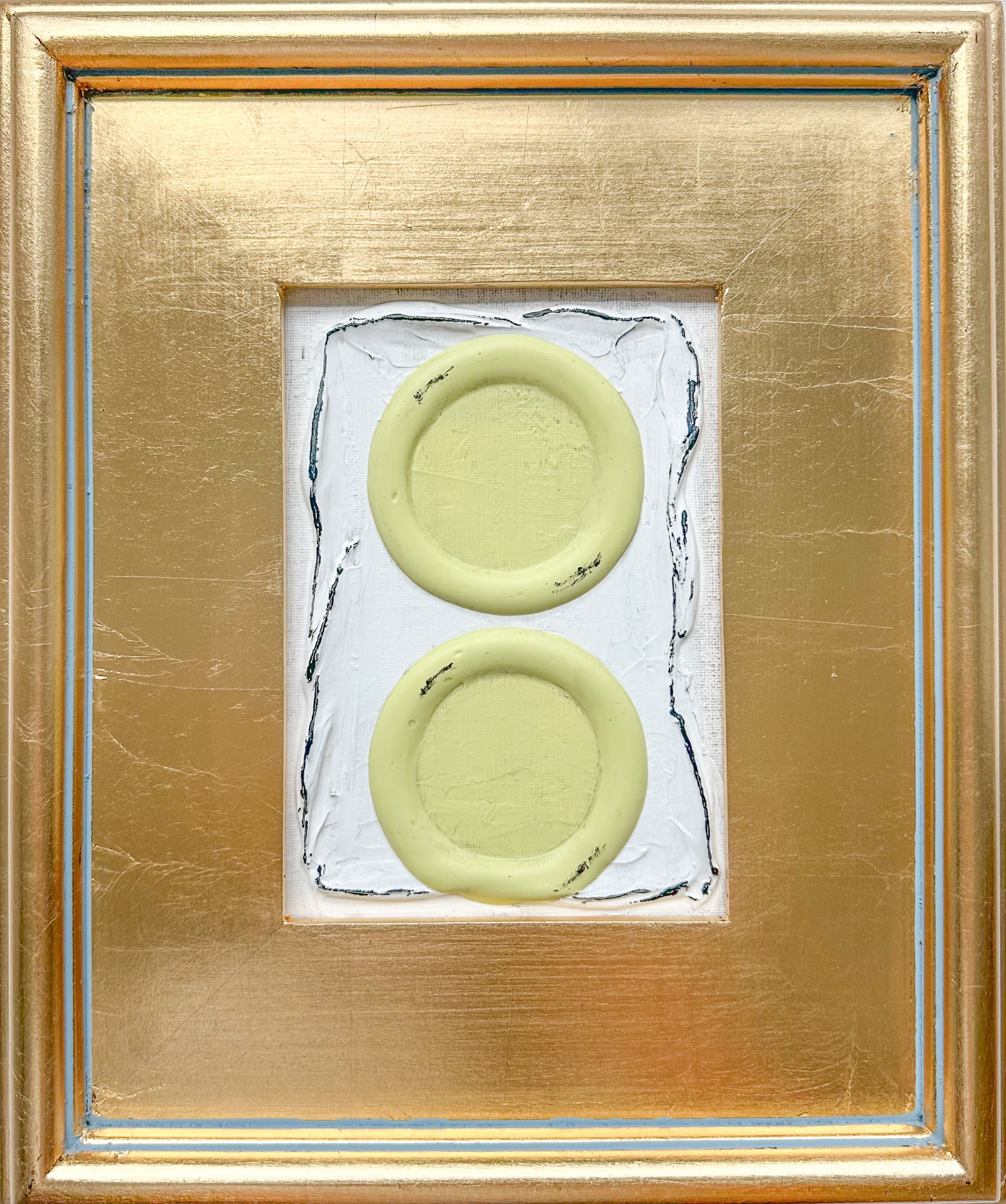 Cream/butter, mixed media, measures 11” by 13” in gold leaf frame